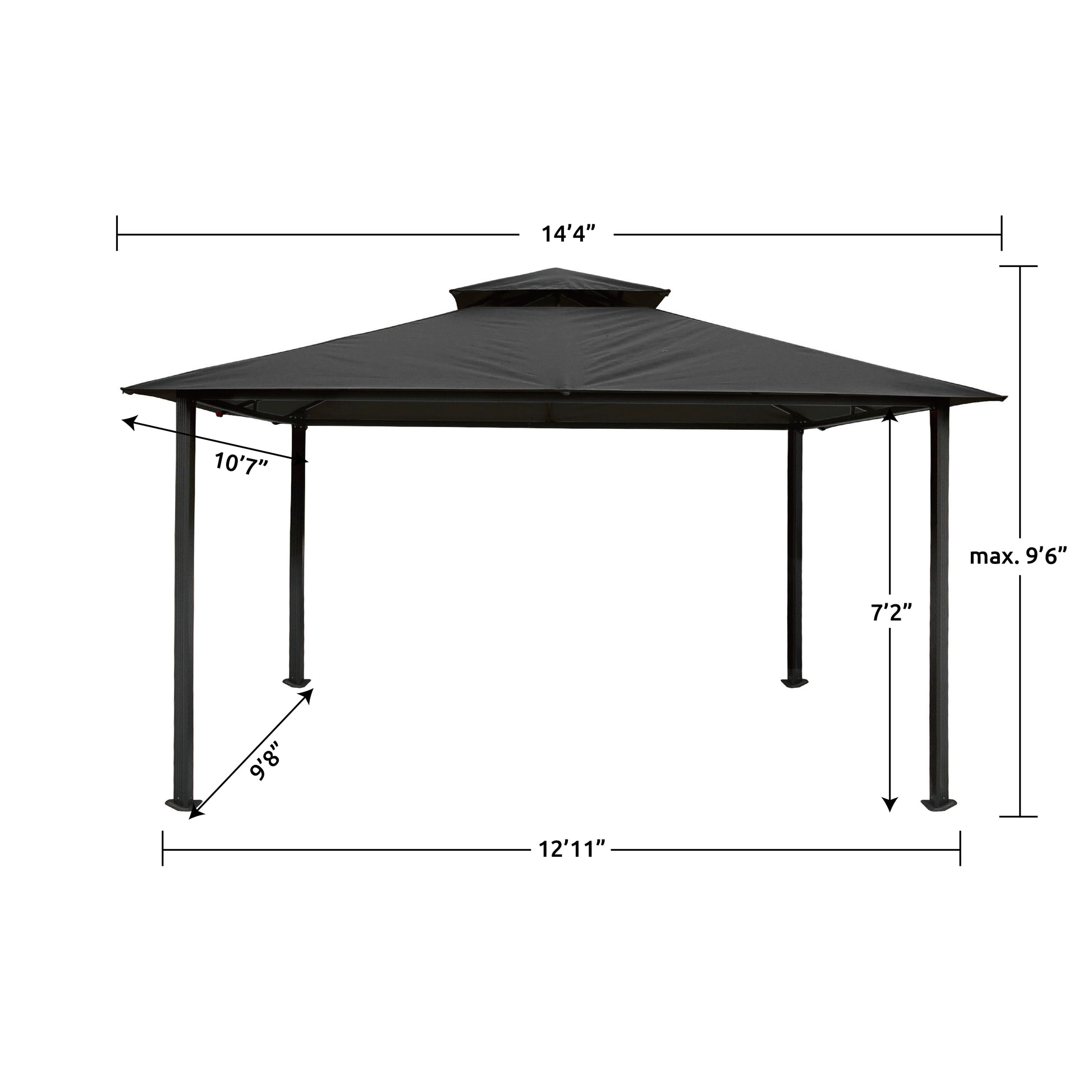 Overall Dimensions: 10′ 7′′ W x 14′ 4′′ D x 9′ 6′′ H
