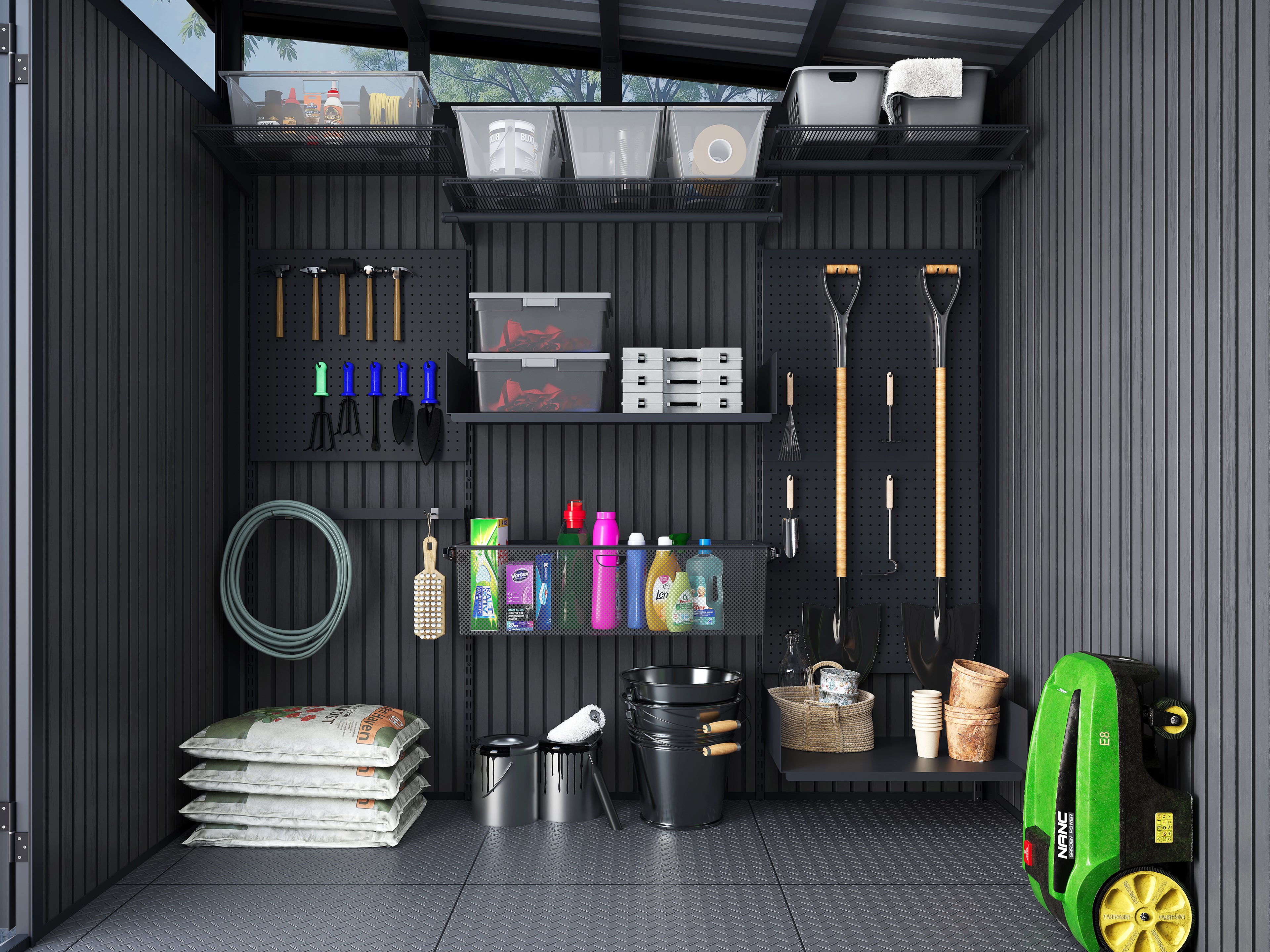 The Maggiore ships as a complete shed kit with all aluminum frame components, WPC wall panels, galvanized steel panel metal roof, lockable all-aluminum double doors with tinted windows, upper transom windows, integrated ventilation system, pre-cut parts, step-by-step instructions, and all assembly hardware. Everything you need to build this storage shed is in the box. No additional raw materials or pre-cut materials are required. For questions about what's included, contact our Customer Experience Team at 877-782-4482.
